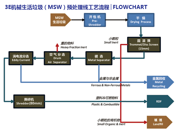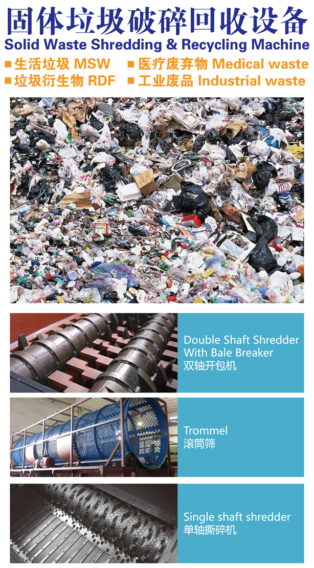 3E Municipal solid waste shredding systemis used for sorting and crushing domestic waste. The separated materials are RDF materials which can be used as fuel (i.e. waste derived fuel), recyclable materials (metals and nonferrous metals), and residual inert materials (usually used for landfill). The production line is easy to operate, versatile, safe, reliable and economical, and the rate of waste treatment can reach 90%.