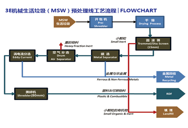 3E Municipal solid waste shredding system, can effectively separate RDF derived fuels from msw. High quality RDF fuel is characterized by uniform size and uniform calorific value. The molding process can increase the calorific value of waste by about 4 times, and it is easy to transport and reserve. RDF derived fuels can be used for energy recovery in power plants, and energy can be efficiently utilized in the form of electricity. Burning ash can be used as an effective component in making cement and broaden the road for the energy of garbage.