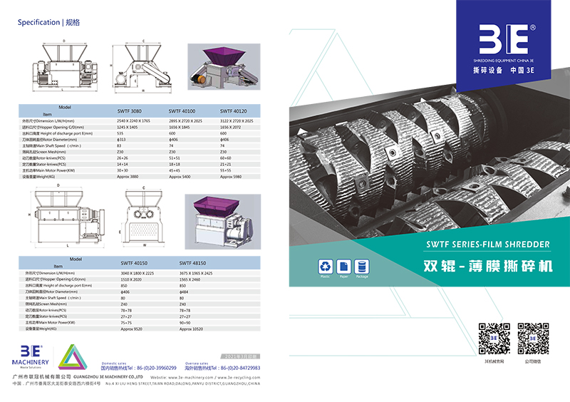 SWTF series film shredders adopt double film shafts design that rotate a medium speed, low noise and high efficient without pusher. Adopt SIENMENS LOGO microcomputer control system with function of start, stop, automatic reverse sensors to protect the machine against over loading and jamming. It is especially suitable for recycling the medium hardness and soft material, for example film, woven bag, jumbo bag, paper and ect. Aiming at different material, it could use different shaft.