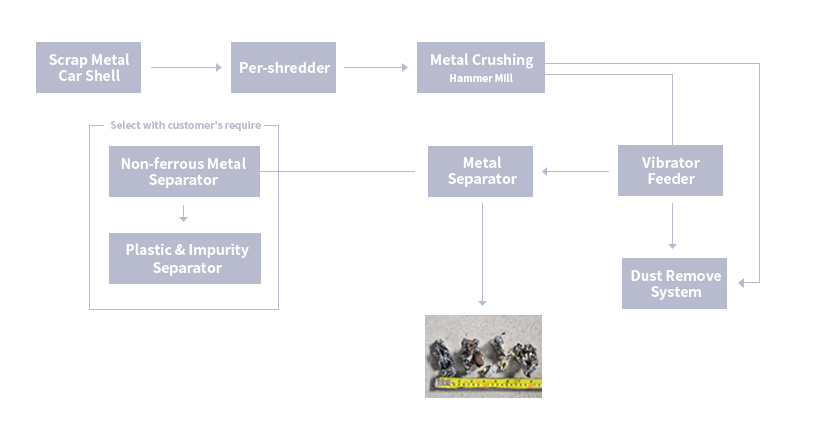 The Scrap Metal Crushing & Recycling line is developed by Guangzhou 3E Machinery Company. The car shell and wasted metal (such as wasted iron, aluminium and engine casing ect) will be crushed, separated by the recycling line, after that, the wasted metal could be reused easily. 3E Company has already got the national invention patent and utility model patent for this recycling line.